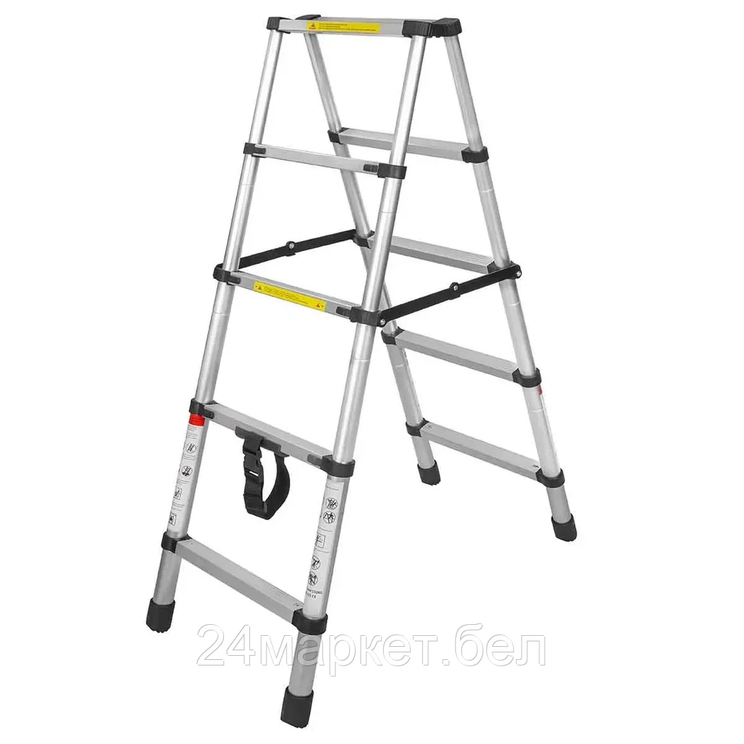 Лестница стремянка телескопическая алюминиевая, максимальная нагрузка: 150 кг. Состоит из двух секций: максимальная высота одной секции 1,4 м на 5 ступенек. Конструкция: лестница трансформер, складная, неразборная. Двухстороннее восхождение с возможностью регулировки высоты подъема. Противоскользящие накладки на ножках обеспечивают устойчивость и безопасность. Оборудована крепежным ремнем для фиксации ступенек. Оснащена фиксатором для защиты от складывания при работе. Изготовлена из алюминиевого сплава высокой прочности, обладающего коррозийной стойкостью. Применяется для проведения ремонтных, строительных и монтажных работ любой сложности. Компактные размеры в сложенном виде (для удобства хранения и транспортировки). Надежная конструкция в сочетании с высокопрочным металлом.