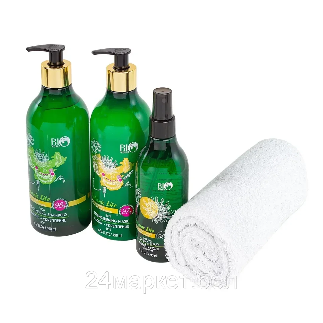 Набор косметики(Маска-укрепление 490мл,шампунь ИМБИРЬ + КРАСНЫЙ ЖЕНЬШЕНЬ, 490 мл+Спрей-уход для волос "БЕСЦВЕТНАЯ ХНА,ИМБИРЬ" , 245мл+полотенце) Bio World BW-9