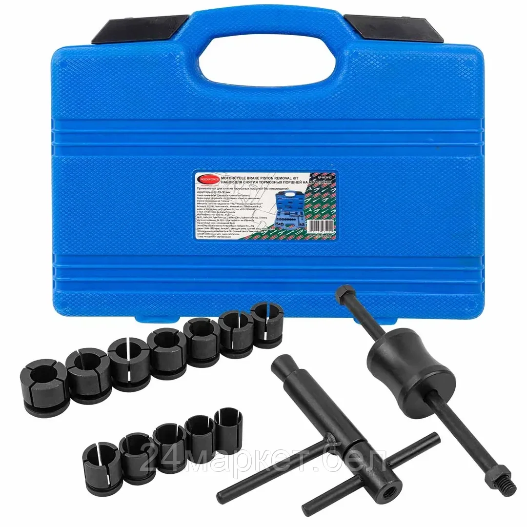 Набор для снятия поршней тормозного суппорта на мотоцикле(расширительные адаптеры:O19-30мм. 14пр.)в кейсе представляет собой комплект инструментов, предназначенных для безопасного и эффективного извлечения поршней тормозных суппортов. В набор входит 12 расширительных адаптеров с диаметрами от 19 мм до 30 мм, что позволяет использовать их с различными моделями мотоциклов. Эти адаптеры позволяют равномерно расширить поршень тормозного суппорта, обеспечивая его безопасное извлечение без повреждения. Каждый адаптер имеет прочную конструкцию, что обеспечивает надежность и долговечность при использовании. Набор поставляется в удобном кейсе, который обеспечивает удобное хранение и транспортировку инструментов. Этот набор является необходимым инструментом для профессиональных механиков и владельцев мотоциклов, позволяя выполнять обслуживание тормозной системы мотоцикла без лишних затрат и проблем.