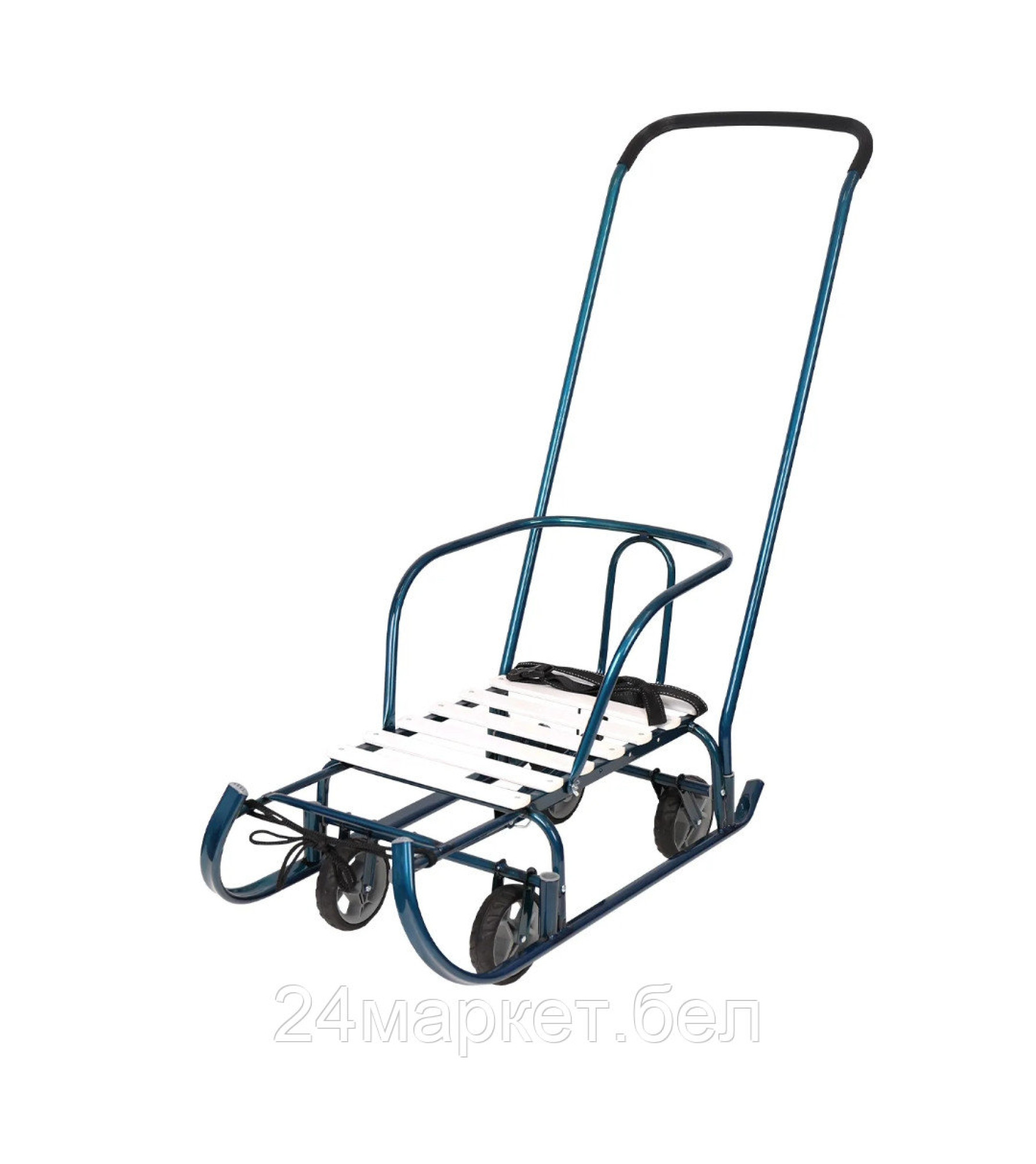 Металлические санки с механизмом выдвижных колесных шасси с родительской ручкой-толкателем для катания и перевозки детей.