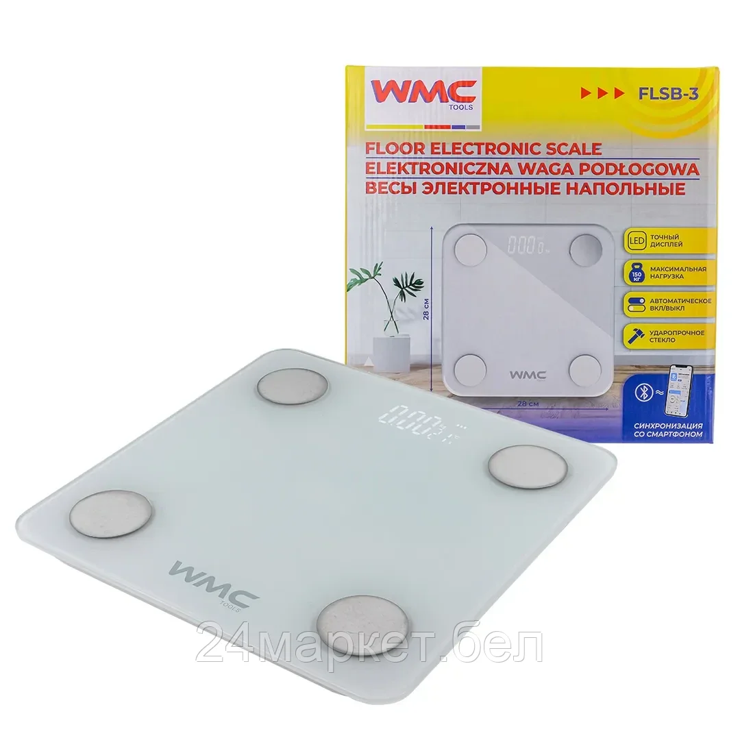 WMC-FLSB-3 WMC TOOLS Весы электронные напольные бытовые (28х28см,макс.нагрузка 150кг,ударопрочное стекло,LCD дисплей,цвет белый,синхронизация со смартфоном)
