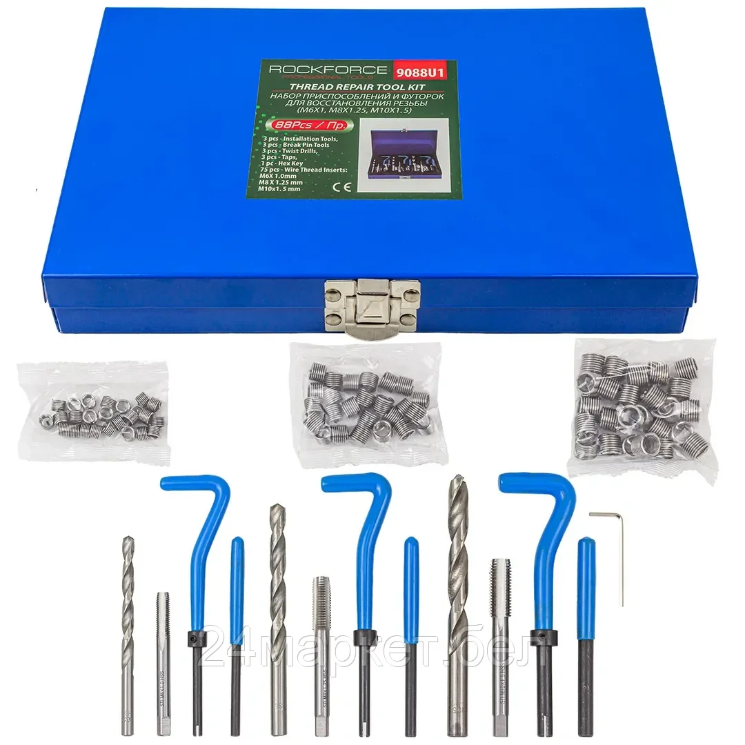 Набор приспособлений и футорок для восстановления резьбы(М6х1, М8х1.25, М10х1.5) 88предметов в металлическом кейсе Такого рода наборы предназначены для восстановления внутренней резьбы, которое осуществляется путём вкручивания пружинной резьбовой вставки. Футорки имеют вид тонкого фиксатора в форме упругой спирали. Во внутренней стороне витки образуют профиль ромбического типа. Изделия оснащены специальными поводковыми язычками, предназначенными для ввинчивания в старую резьбу. После установки старый элемент можно будет легко отсоединить. Их можно использовать практически для любой резьбы. Используются когда при замене свечей в автомобиле срывается старая резьба, также для монтажа сантехнического оборудования. Изготавливаются резьбовые вставки, как правило, из нержавеющей стали. Изделия, изготовленные из такой металлической основы, обладают высоким уровнем прочности, износостойкости и долговечности.