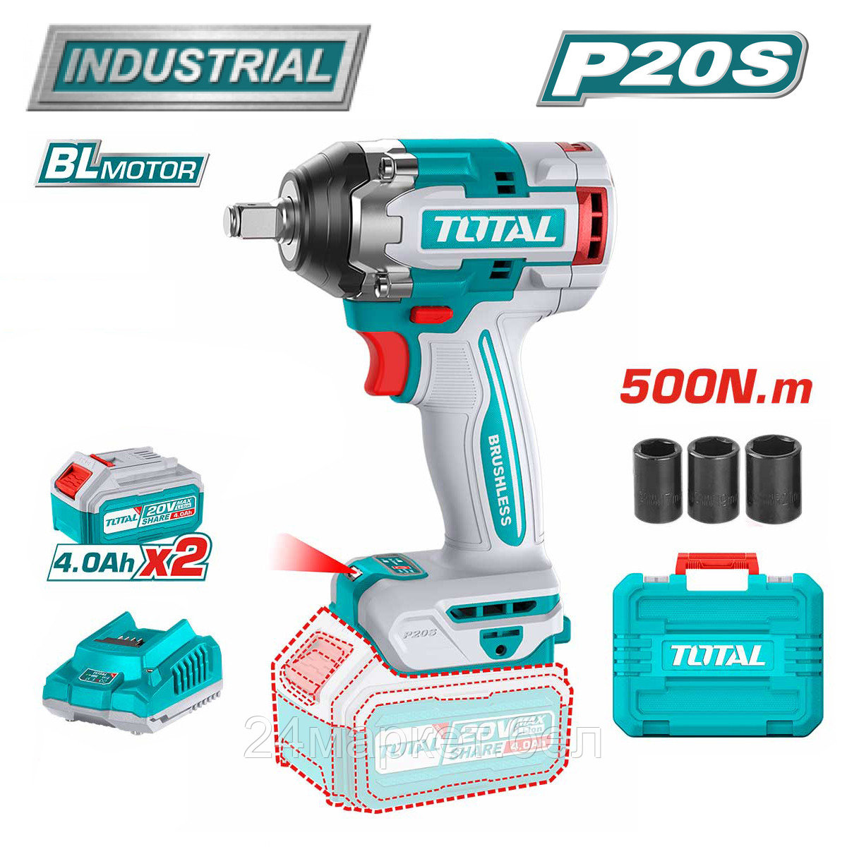 | Информация | ? Новая модель индустриального гайковерта TOTAL TIWLI2050 предназначена для интенсивного использования.###BR###? Увеличенный крутящий момент до 500 Нм.###BR###? Бесщеточный мотор с защитой силовой электроники.###BR###? Металлический корпус редуктора и эластичное покрытие рукоятки.###BR###? Электронная регулировка крутящего момента и светодиодная подсветка.###BR###? Входит в систему TOTAL P20S, включающую 150+ изделий, работающих от единого АКБ.###BR###? В комплекте 2 АКБ, ЗУ и набор головок, упакованных в кейс.###BR###?? Частота ударов в минуту: 0-2400 / 0-2800 / 0-3300###BR###?? Частота вращения шпинделя, об/мин: 0-1200 / 0-1800 / 0-2200 |